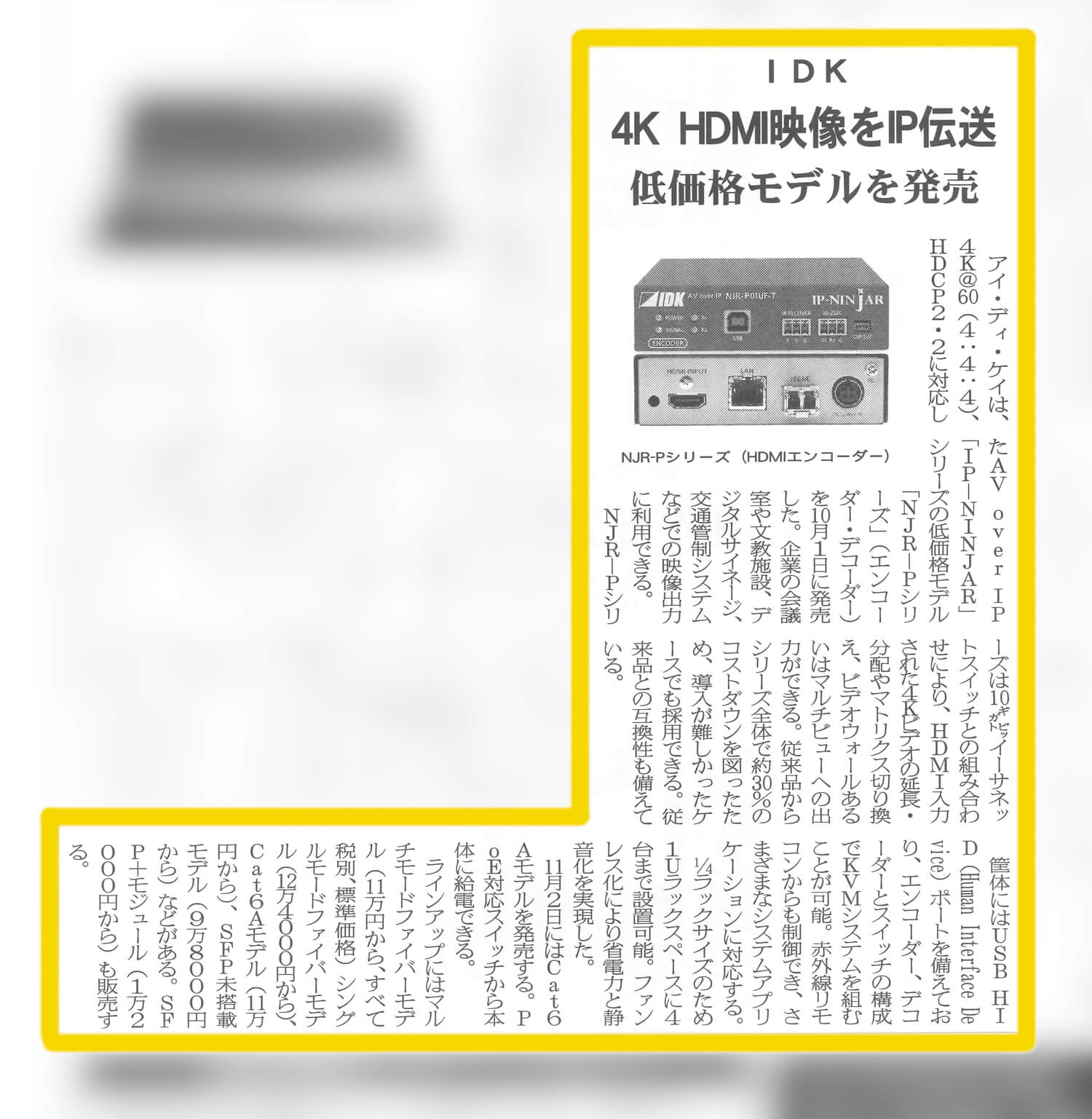 | 映像新聞 「NJR-P01シリーズに関する記事が掲載されました」 | |