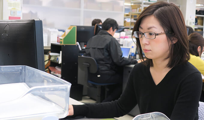 お客様からいただいた注文書の受注処理や商品の在庫確認、価格などの問い合わせに関する対応、物流部門への出荷依頼などが中心です。外に出ている営業に代わって資材課への発注依頼や納期確認、そしてお客様への見積書の作成といった業務も行います。