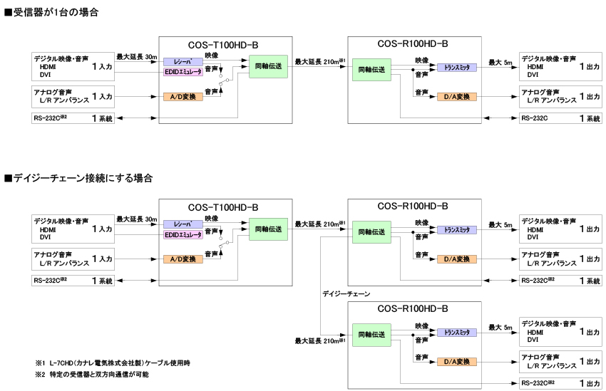 なお、送信器と受信器の間の延長用デジタル信号は、独自フォーマットを採用しています。そのため、送信器と受信器の間に、他の機器を接続することはできません。