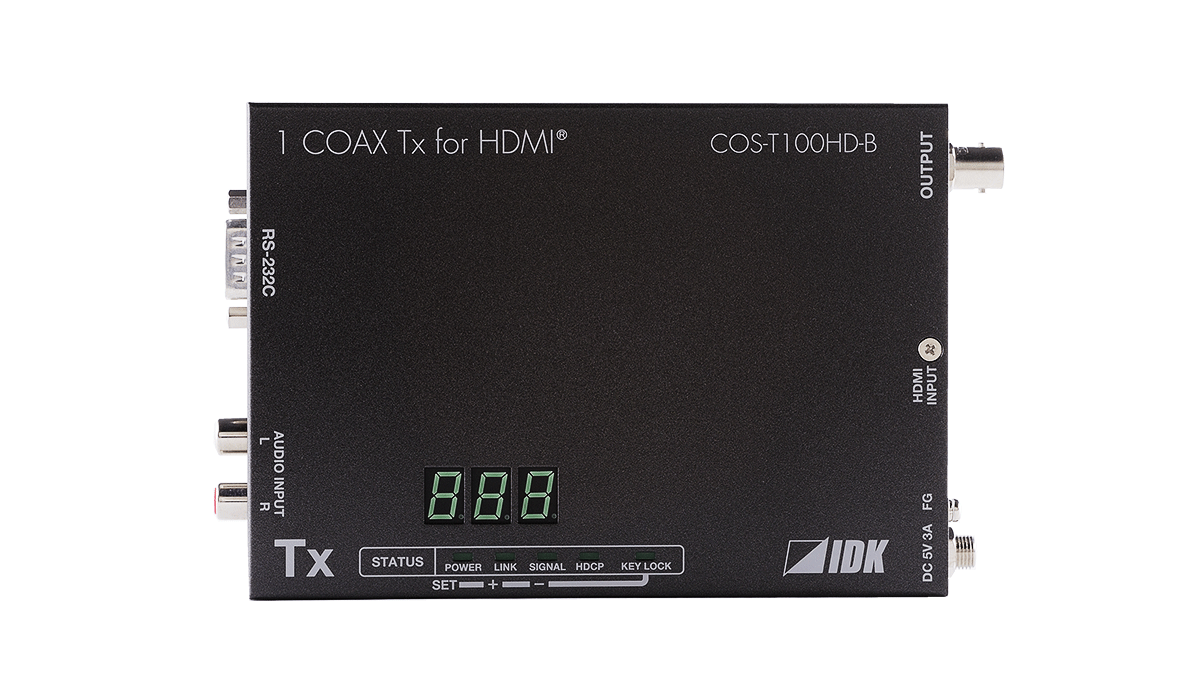 同軸ケーブルを使用して長距離伝送を行うHDMI送信器です。受信器との組み合わせにより、映像・音声信号の延長・分配が可能です。RS-232Cのシリアル双方向通信にも対応しています。