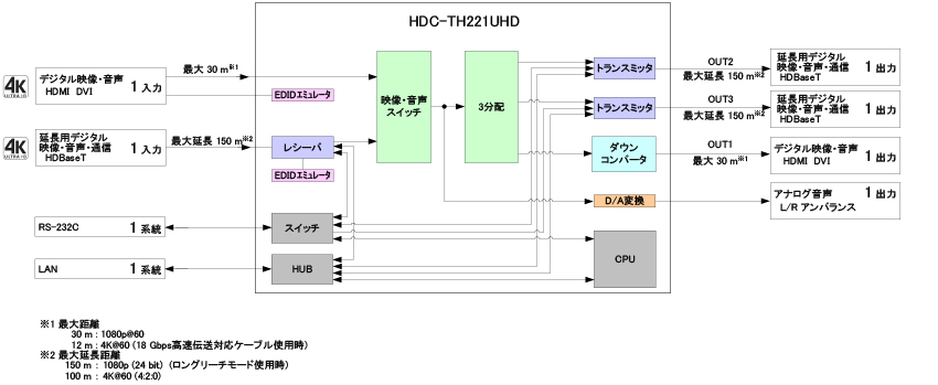 | デジタル出力部 | HDMI / DVI :最大30 m (1080p@60)、最大12 m (4K@60) HDBaseT :最大延長100 m 、最大延長 150 m (ロングリーチモード使用時) |