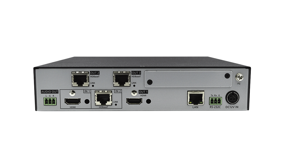 | 機能 | WEBブラウザー制御、入力チャンネル自動切換、アンチストーム、コネクションリセット、ボタンロック、OUT1のみダウンコンバート対応 (4Kから1080pへの変換) 、状態通知、出力ごとの映像ミュート / オフ、入出力信号ステータス表示、HDBaseTステータス表示 | |