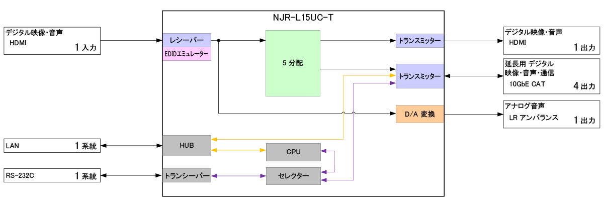 NJR-L13UC-T(エンコーダー)/NJR-L15UC-T(エンコーダー)/NJR-L13UC-R(デコーダー)/NJR-L15UC-R(デコーダー)は、4K@60対応のHDMI信号をツイストペアケーブルで長距離伝送するEDIDエミュレート機能搭載のAV over IP機器です。