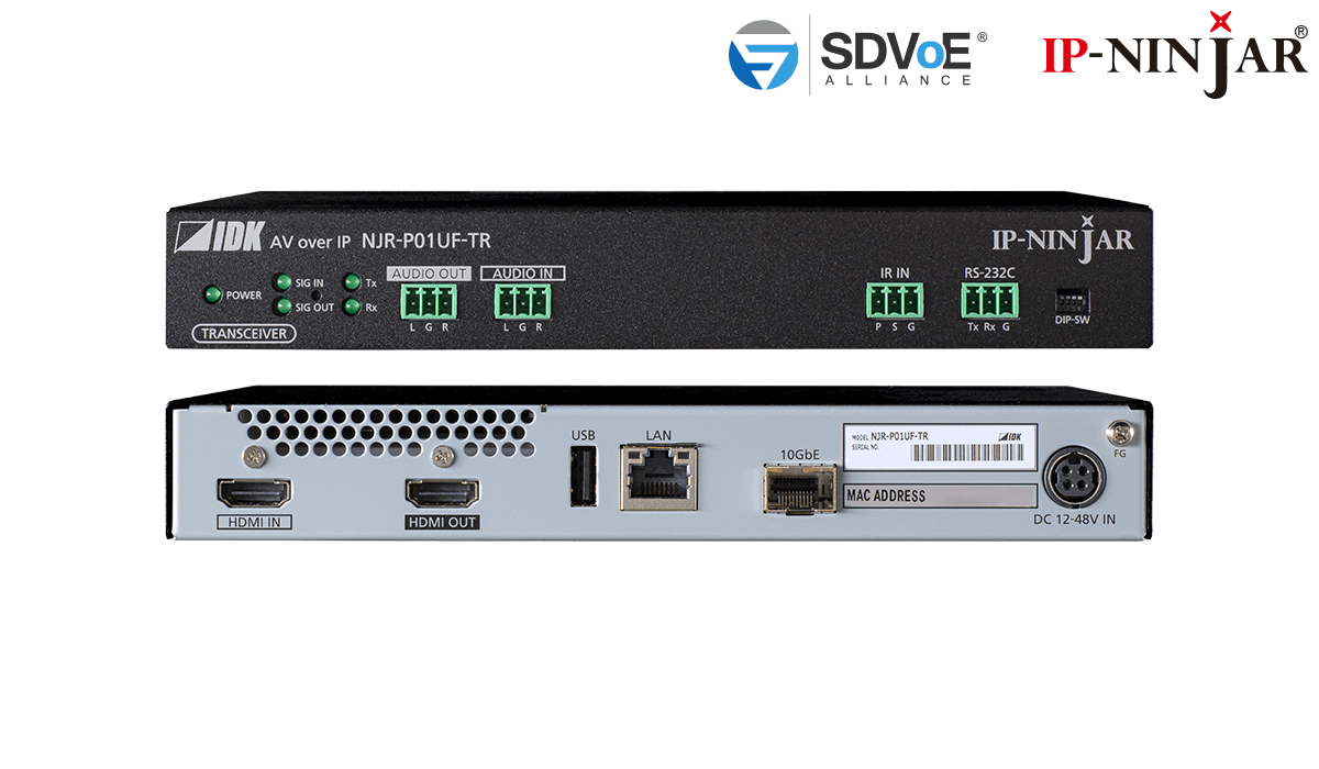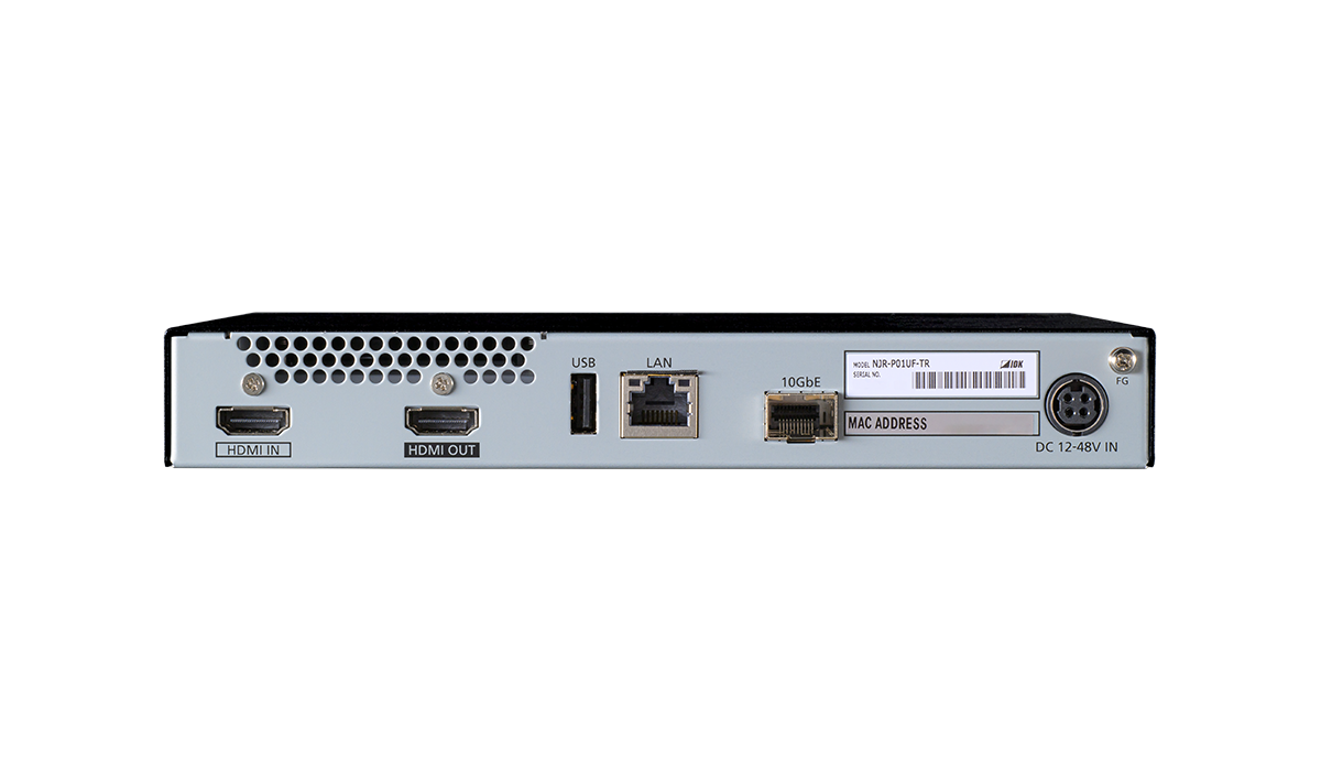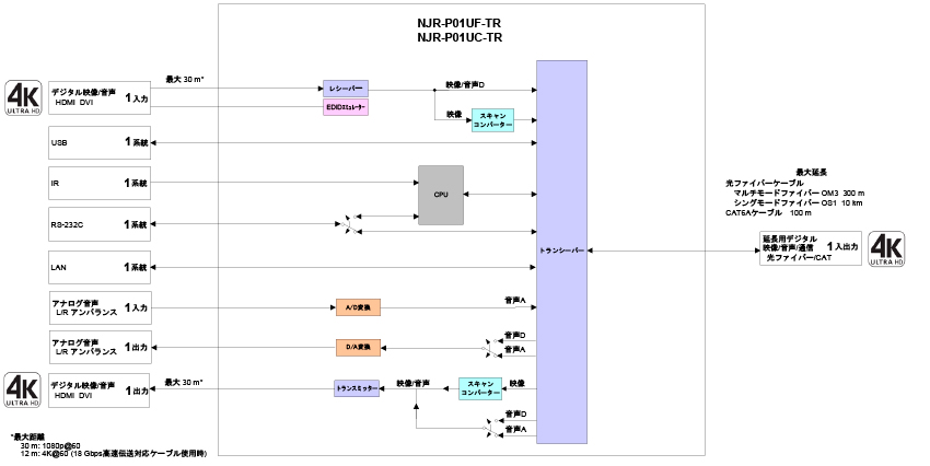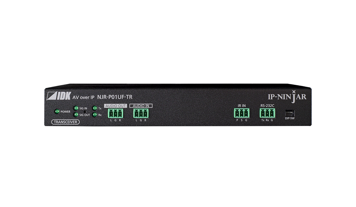 NJR-P01UF-TR(トランシーバー)は、HDMI信号とRS-232C、LAN、KVMなどのUSBを光ファイバーケーブルで長距離伝送するAV over IP機器です。映像信号は最大4K@60(4:4:4)、HDCP 2.2に対応しています。