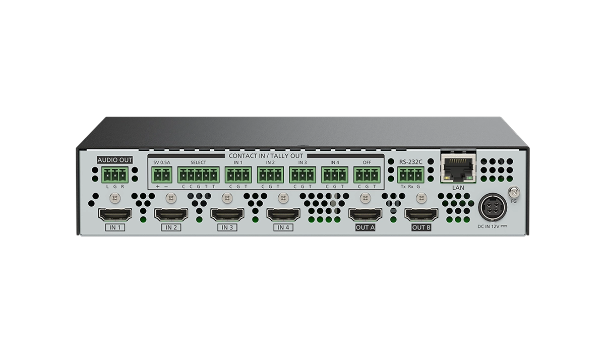 映像入力はHDMI 4系統です。入力された映像信号は、最大4K@60に変換して、HDMI信号で2分配出力します。