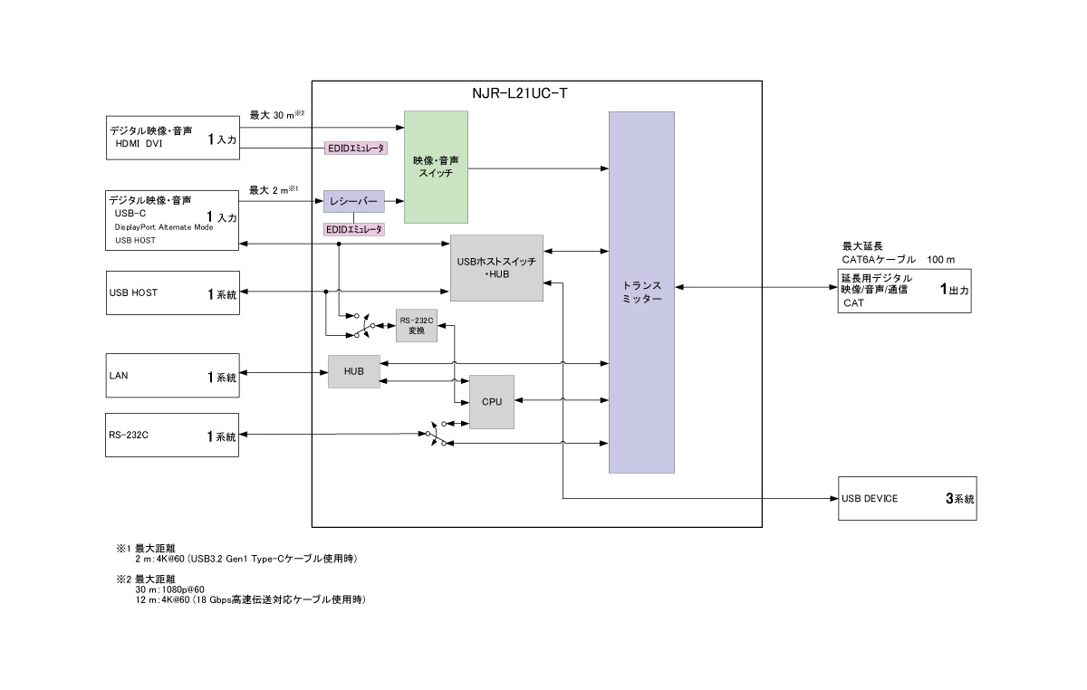 NJR-L21UC-T(エンコーダー)/NJR-L31UC-R(デコーダー)は、HDMI/USB-C映像信号と、RS-232C、LAN、USBをツイストペアケーブル(CAT6A)で長距離伝送するAV over IP機器です。映像信号は最大4K@60(4:4:4)、HDCP2.2に対応しています。