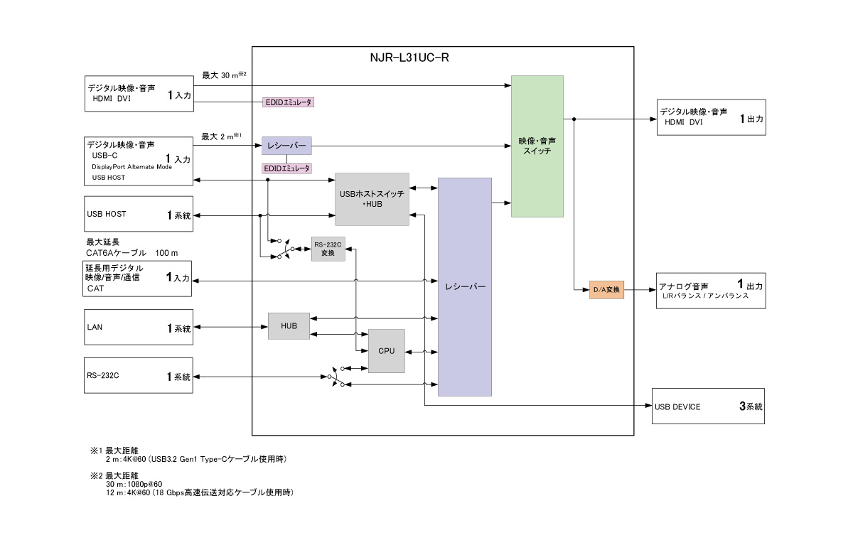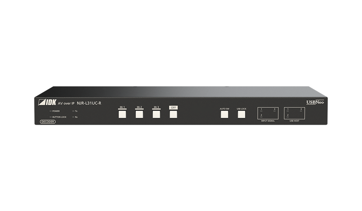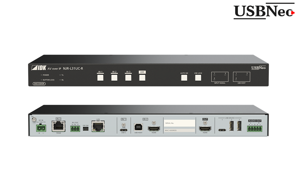 NJR-L21UC-T(エンコーダー)/NJR-L31UC-R(デコーダー)は、HDMI/USB-C映像信号と、RS-232C、LAN、USBをツイストペアケーブル(CAT6A)で長距離伝送するAV over IP機器です。映像信号は最大4K@60(4:4:4)、HDCP2.2に対応しています。