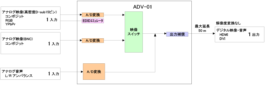 | 出力音声 | デジタルオーディオ | 1系統 2チャンネルリニアPCM サンプリング周波数:48 kHz、量子化ビット数:24 bit 基準レベル:-20 dBFS 最大出力レベル:0 dBFS コネクタ:DVI-I(29ピン)・メス ※入力のアナログオーディオ L/Rをエンベデット出力 |