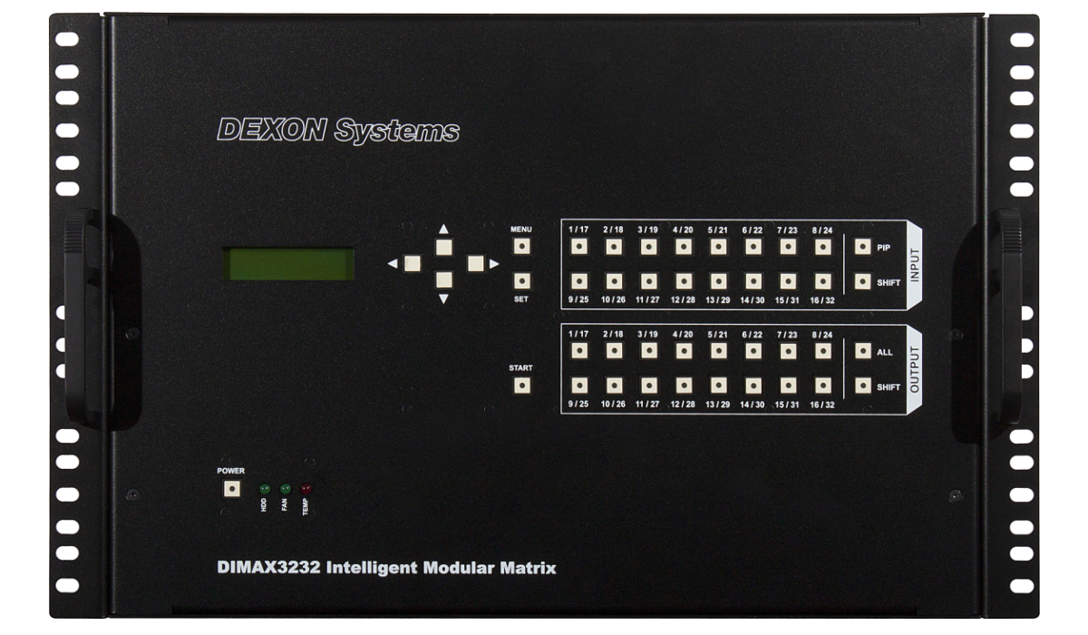またアナログ音声のエンベデッド、ディエンベデッドにも対応しています。ブラウザからの制御、LAN(コマンド)制御、RS-232Cからの制御が可能です。本体シャーシは4U、7U、14Uが用意されており、最大64入力64出力(14U) のマトリクスを構成することが可能です。