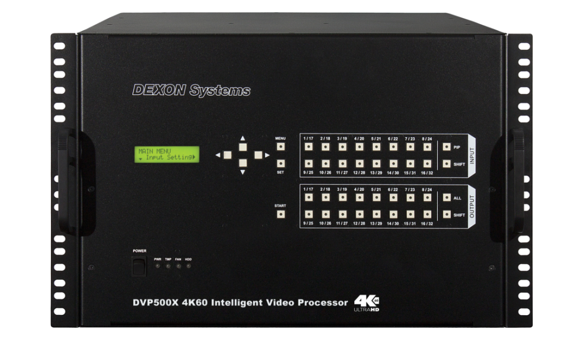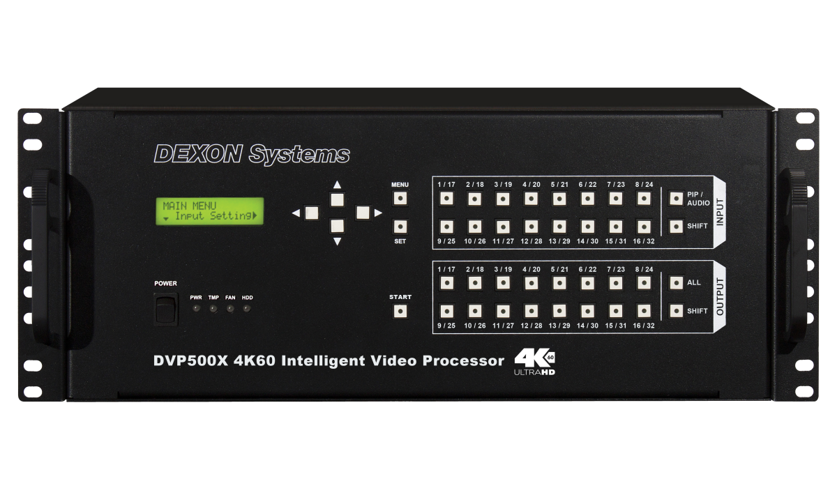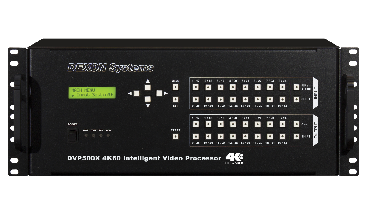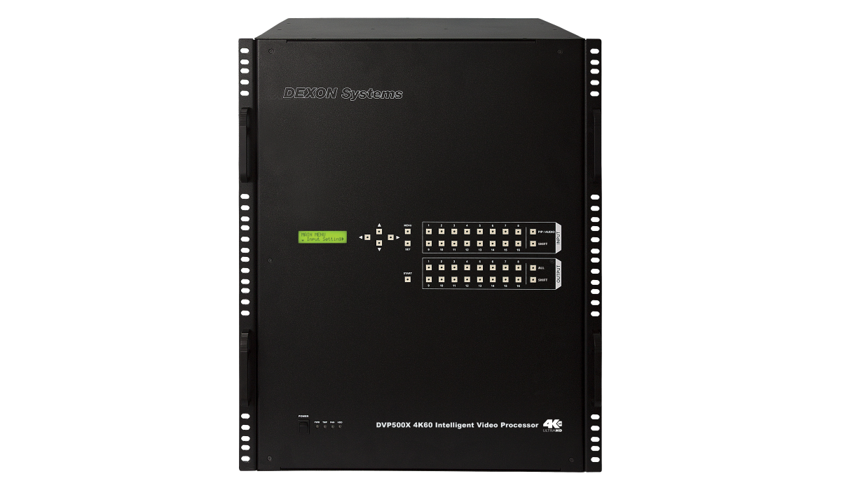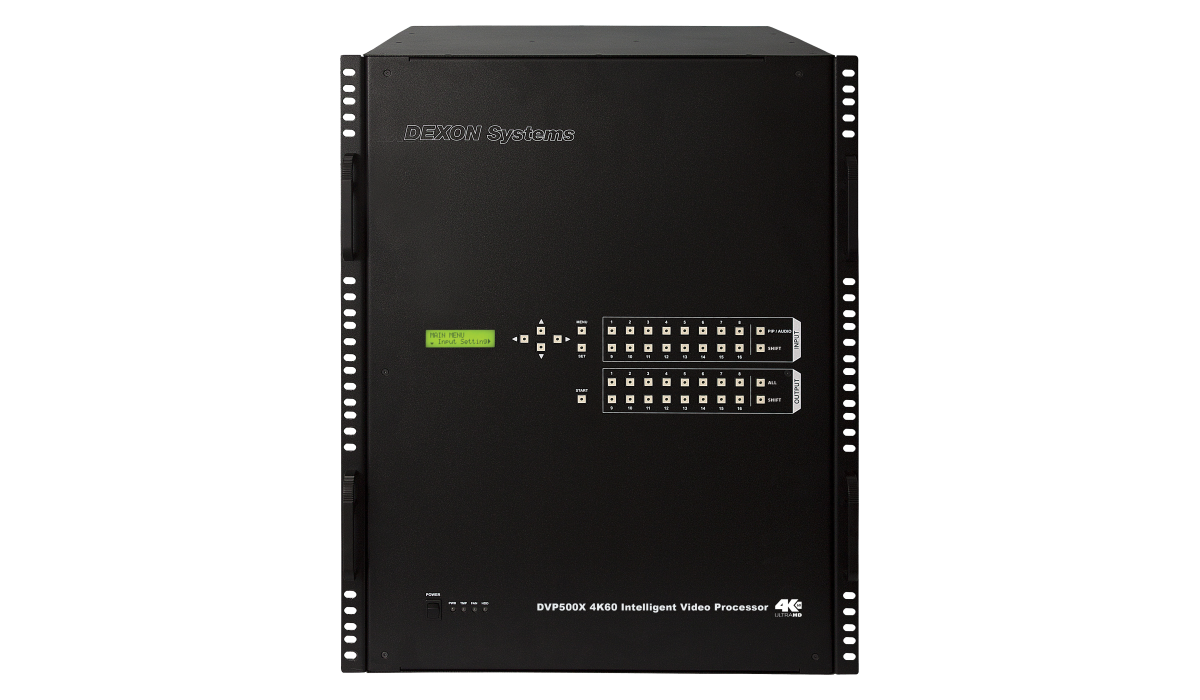 DVP500xはスケーラーを搭載した4K@60、完全シームレス対応のビデオプロセッサーです。入出力カードは多様な信号フォーマットに対応しており、ボード単位で選択が可能となっています。PinP (ピクチャ・イン・ピクチャ) 機能を搭載しており、1つの表示器に最大8ウインドウまで目地をまたいで表示可能です。またアナログ音声のエンベデッド、ディエンベデッドにも対応しています。ブラウザからの制御、LAN (コマンド) 制御、RS-232Cからの制御が可能です。本体シャーシは4U、7U、14Uが用意されており、最大144入力72出力 (14U) のビデオウォールを構成することが可能です。