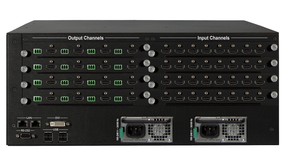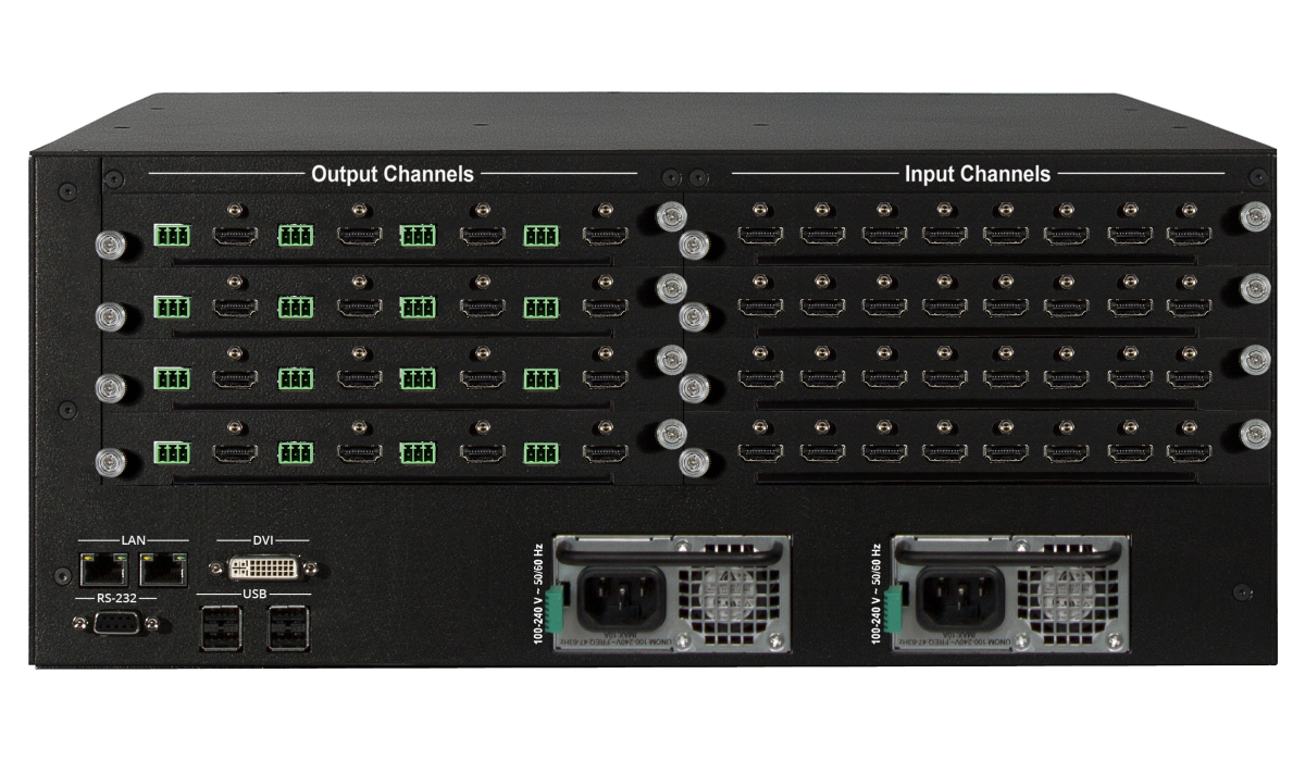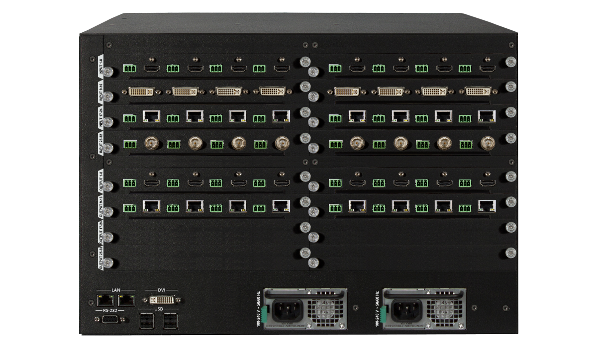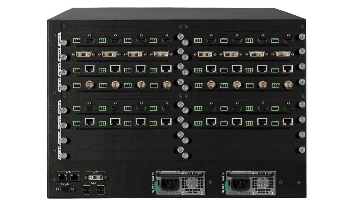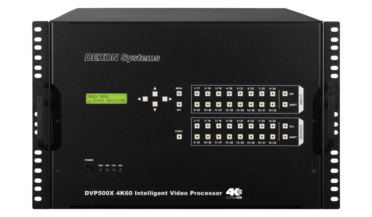 DVP500xはスケーラーを搭載した4K@60、完全シームレス対応のビデオプロセッサーです。入出力カードは多様な信号フォーマットに対応しており、ボード単位で選択が可能となっています。PinP (ピクチャ・イン・ピクチャ) 機能を搭載しており、1つの表示器に最大8ウインドウまで目地をまたいで表示可能です。またアナログ音声のエンベデッド、ディエンベデッドにも対応しています。ブラウザからの制御、LAN (コマンド) 制御、RS-232Cからの制御が可能です。本体シャーシは4U、7U、14Uが用意されており、最大144入力72出力 (14U) のビデオウォールを構成することが可能です。