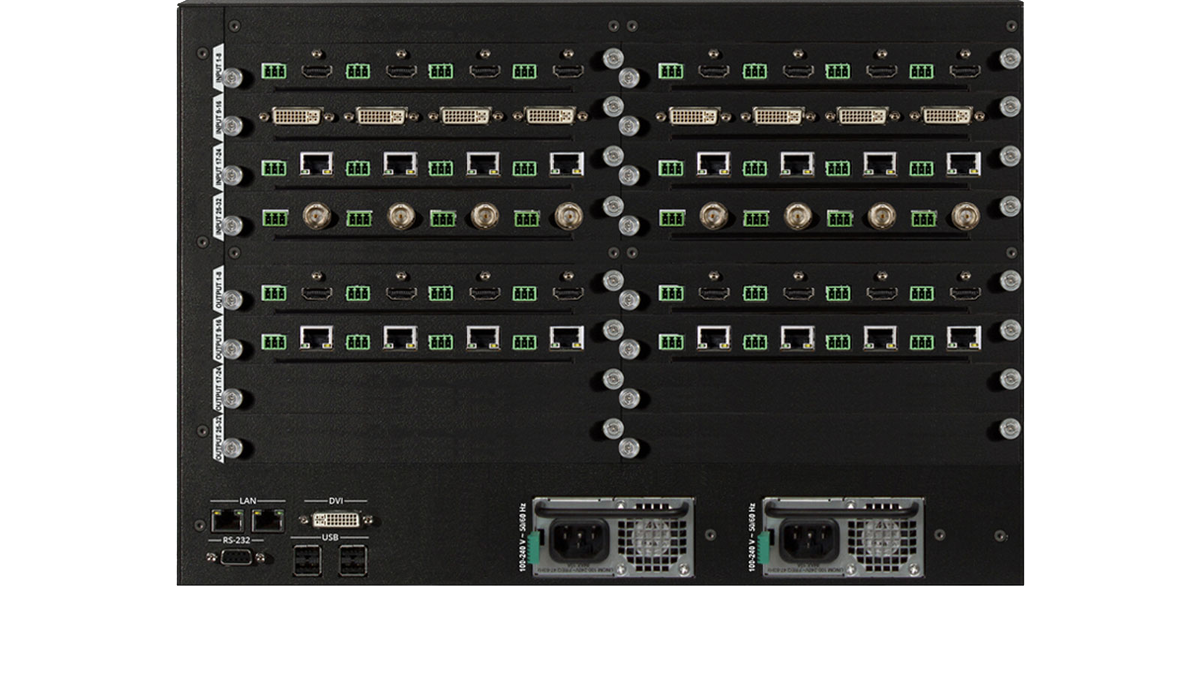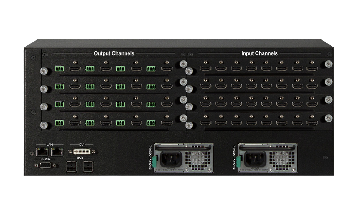 DXN6000シリーズはHDCP(著作権保護)に対応したWindowsベースの4K@60対応ビデオウォールコントローラーです。最大144入力72出力の構成が可能です。入力カードは最大8系統単位、出力カードは最大4系統単位で選択が可能です(PinP4モデルは2系統、PinP8モデルは1系統単位で出力カードを選択可能です)。