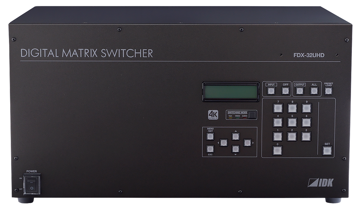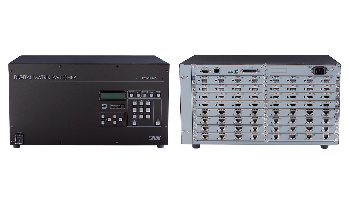 | 機能 | 映像音声非連動切換 (音声マトリックススイッチャーMAU-3232 (オプション) 接続時)、入出力スロットボード・CPUスロットボード・ファンユニットはラックから外さず交換可能、プリセットメモリー (32メモリー)、ラストメモリー、オペレーションロック、アンチストーム、コネクションリセット、4系統単位で入出力数のカスタマイズが可能、RS-232C伝送 (4K HDBaseT入出力スロットボード) 、ヘルスチェック、全機能設定ブラウザ搭載、バックアップ電源対応 (オプション) | ||
