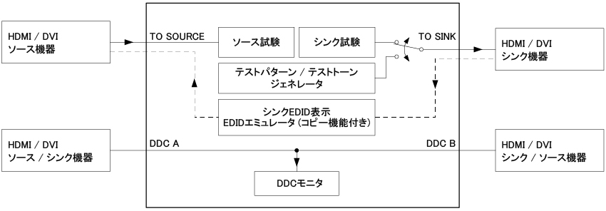 ソース試験、シンク試験、ケーブル / 伝送路試験、およびソース機器とシンク機器間のDDCモニタなどができます。