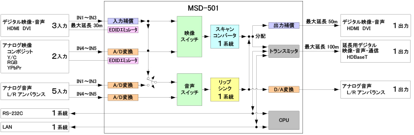 映像入力はデジタル3系統・アナログ2系統を搭載し、HDMI信号・DVI信号・コンポジットビデオ信号・Y/C信号・アナログRGB信号・アナログYPbPr信号の入力が可能です。入力された映像信号は、最大QWXGAまたは1080pの解像度に変換し、HDMI信号またはDVI信号と、HDBaseT信号に2分配出力します。