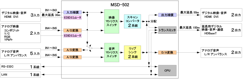 映像入力はデジタル3系統・アナログ2系統を搭載し、HDMI信号・DVI信号・コンポジットビデオ信号・Y/C信号・アナログRGB信号・アナログYPbPr信号の入力が可能です。入力された映像信号は、最大QWXGAまたは1080pの解像度に変換し、HDMI信号またはDVI信号と、HDBaseT信号に2分配出力します。