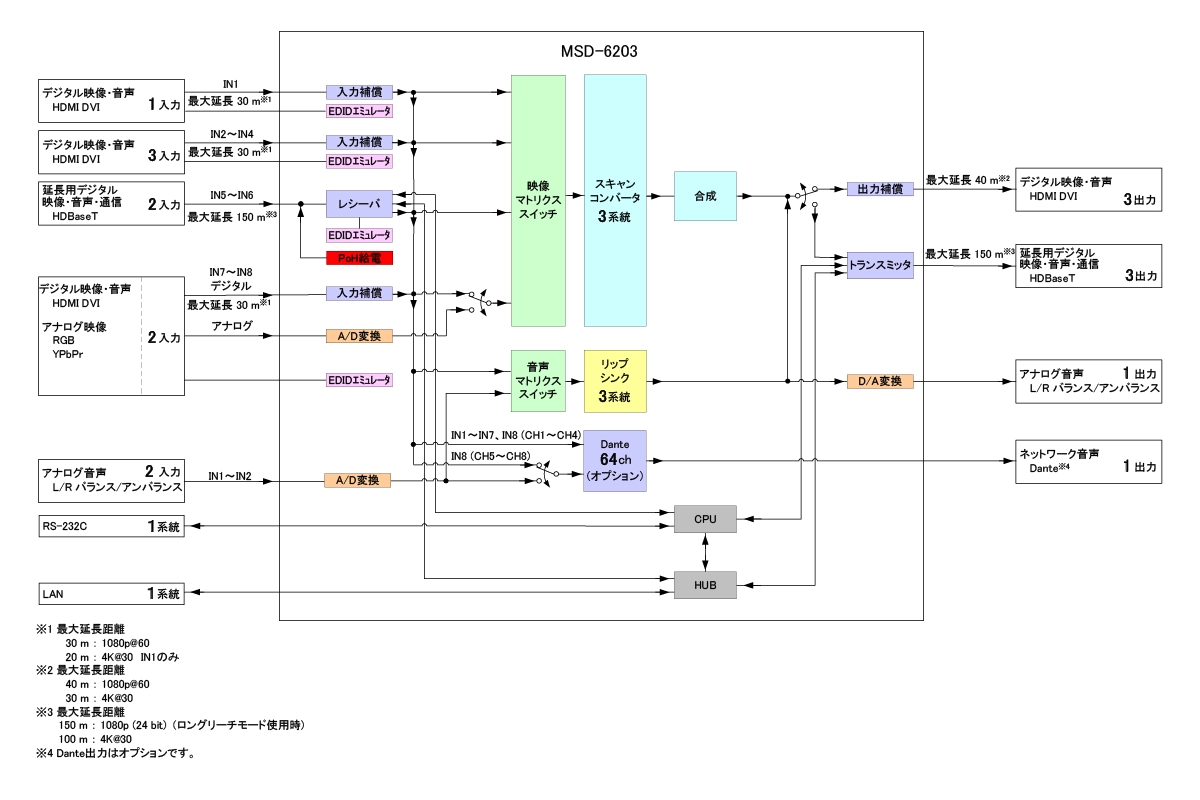 | デジタル出力部 | HDMI / DVI : 40 m (1080p@60)、30 m (4K@30) HDBaseT :100 m、150 m (ロングリーチモード使用時) |