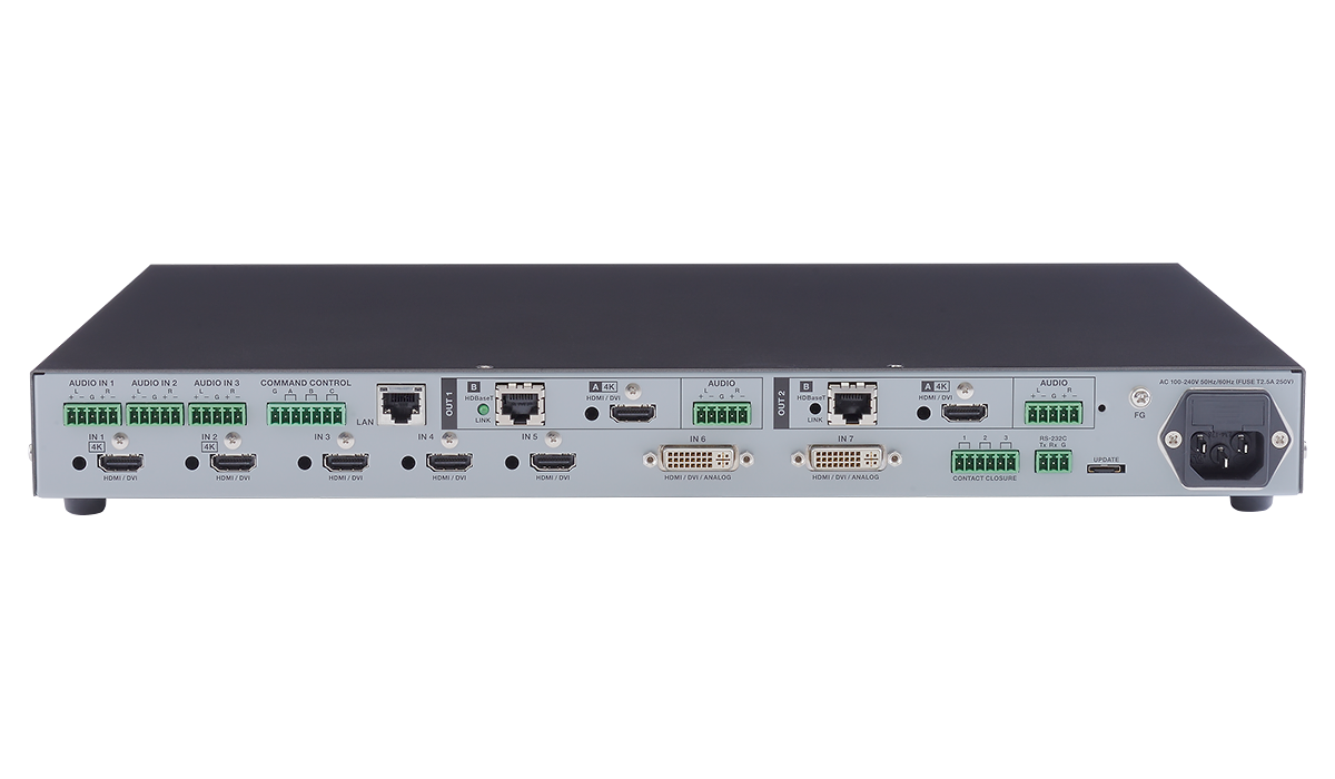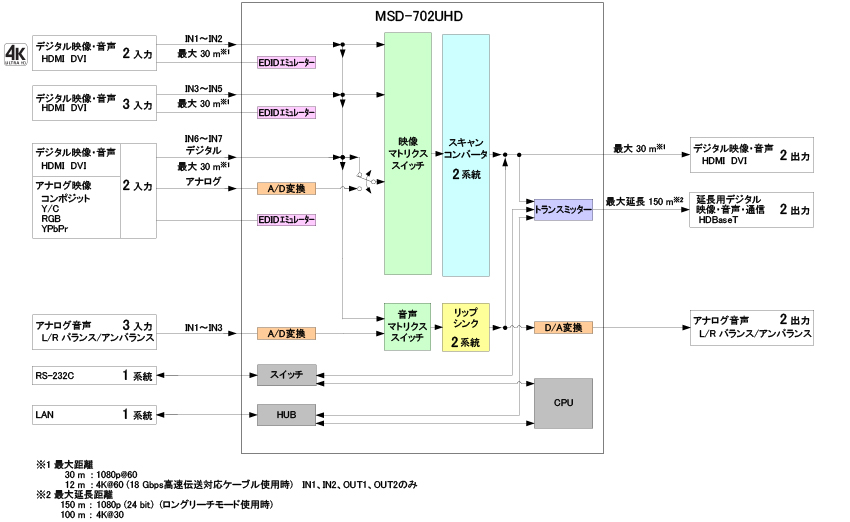 映像入力はデジタル7系統とアナログ2系統を搭載し、HDMI信号、DVI信号、コンポジットビデオ信号、Y/C信号、アナログRGB信号およびアナログYPbPr信号の入力が可能です。入力された映像信号は、最大4K@60の解像度に変換し、HDMI信号とHDBaseT信号で2分配出力します。
