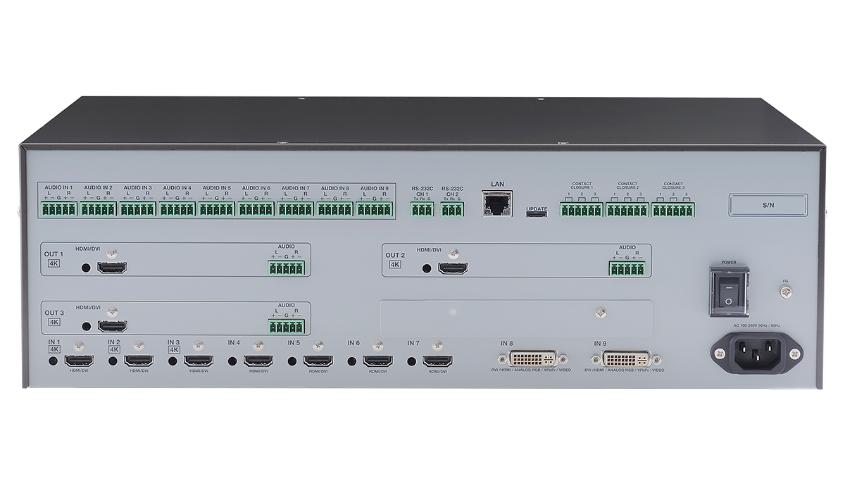 9入力3出力のスキャンコンバーター内蔵デジタルマルチスイッチャーです。