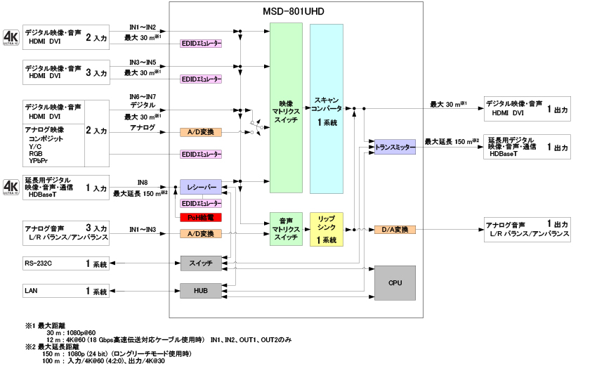 入力された映像信号は、最大4K@60の解像度に変換し、HDMI信号とHDBaseT信号で2分配出力します。