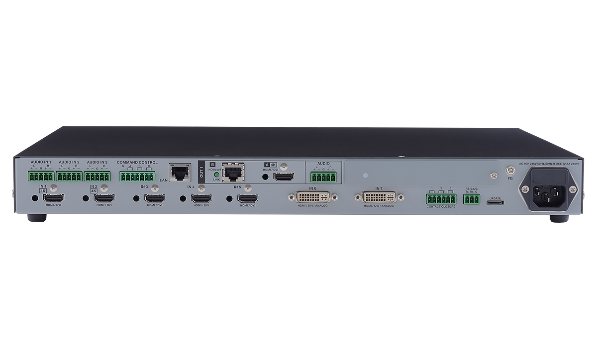 映像入力はデジタル8系統とアナログ2系統を搭載し、HDMI信号、HDBaseT信号、DVI信号、コンポジットビデオ信号、Y/C信号、アナログRGB信号およびアナログYPbPr信号の入力が可能です。