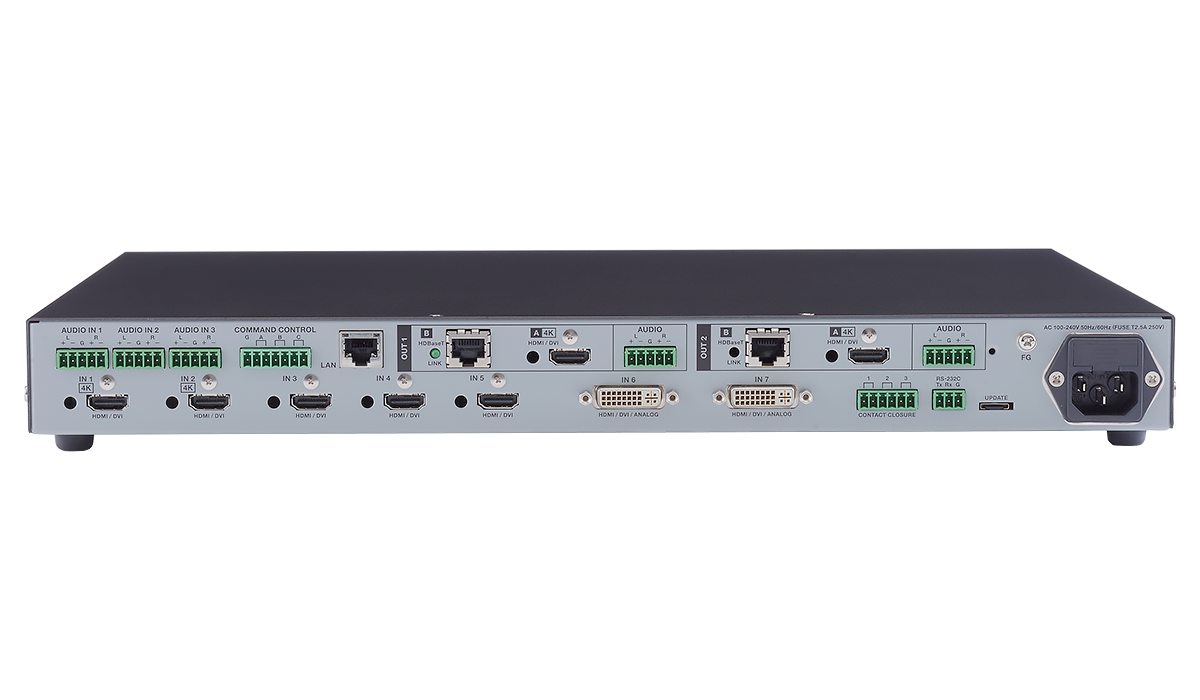 映像入力はデジタル8系統とアナログ2系統を搭載し、HDMI信号、HDBaseT信号、DVI信号、コンポジットビデオ信号、Y/C信号、アナログRGB信号およびアナログYPbPr信号の入力が可能です。