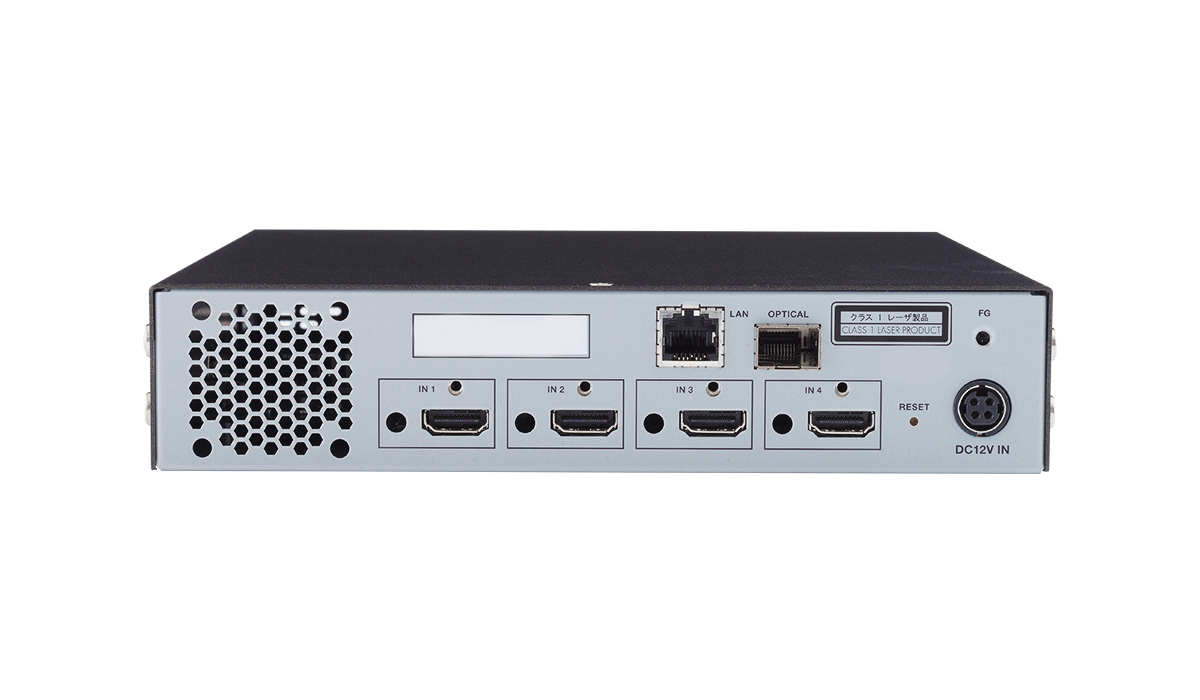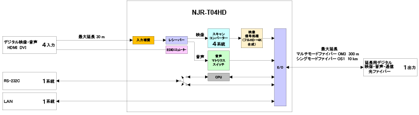 4系統のHDMI信号を1組の光ファイバーケーブルで長距離伝送し、RS-232Cの双方向通信とLANの伝送にも対応しています。