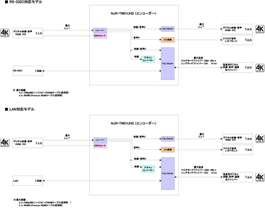 | 搭載SFP+モジュール | NJR-TW01UHD-MM-232/LAN NJR-RW01UHD-MM | NJR-TW01UHD-SM-232/LAN NJR-RW01UHD-SM |