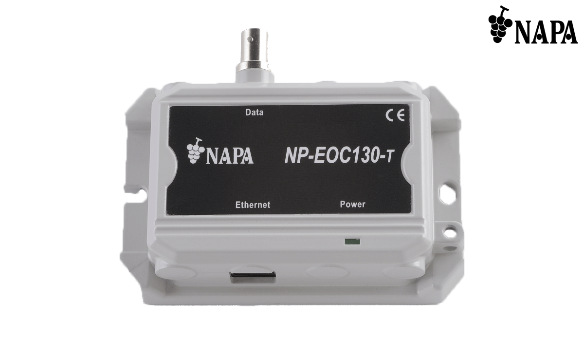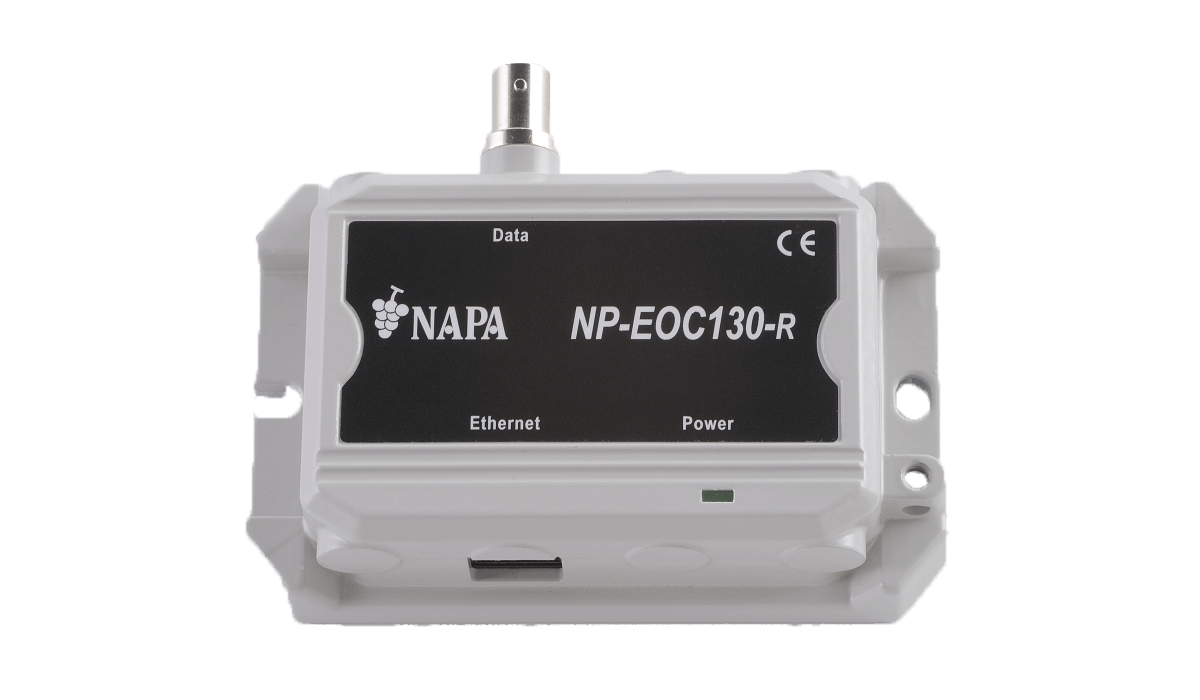NP-EOC130-TR は同軸ケーブル(5C-2 V相当) を使用して、イーサネット及び電源(PoE+:IEEE802.3at準拠) を200 m~ 300 m伝送する伝送器です。