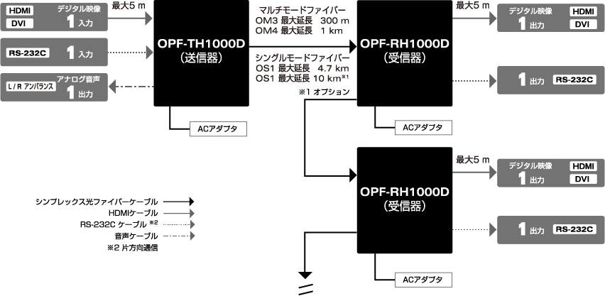 OPF-TH1000D(送信器)入力された信号は非圧縮、無加工で伝送されるため、画質劣化がありません。また、RS-232Cのシリアル片方向通信、HDMIエンベデッド音声を送信器側でアナログ出力が可能です。