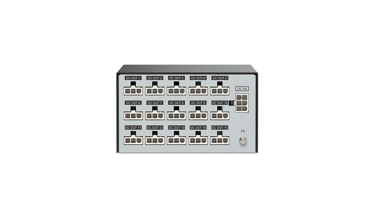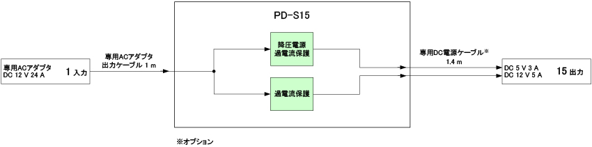 出力はDC 5 VとDC 12 Vがあり、専用のDC電源ケーブルを使用して、最大15系統まで電源を一括供給することができます。