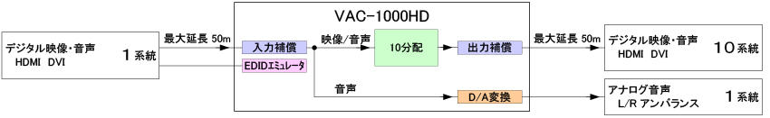 | 機能 | 入力補償機能 (自動 / 手動)、出力補償機能 (手動)、アンチストーム機能、アナログ音声変換出力機能、 DDCバッファ搭載、入出力信号状態表示機能、コネクションリセット機能 |