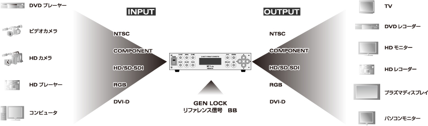 XC1シリーズは、広範囲なビデオ信号およびPC映像信号などの、各種アナログ / デジタル映像信号を用途に応じてさまざまな信号形式に変換することができるコンパクトな新世代フォーマットコンバーターです。 (デジタルアーツ社製)