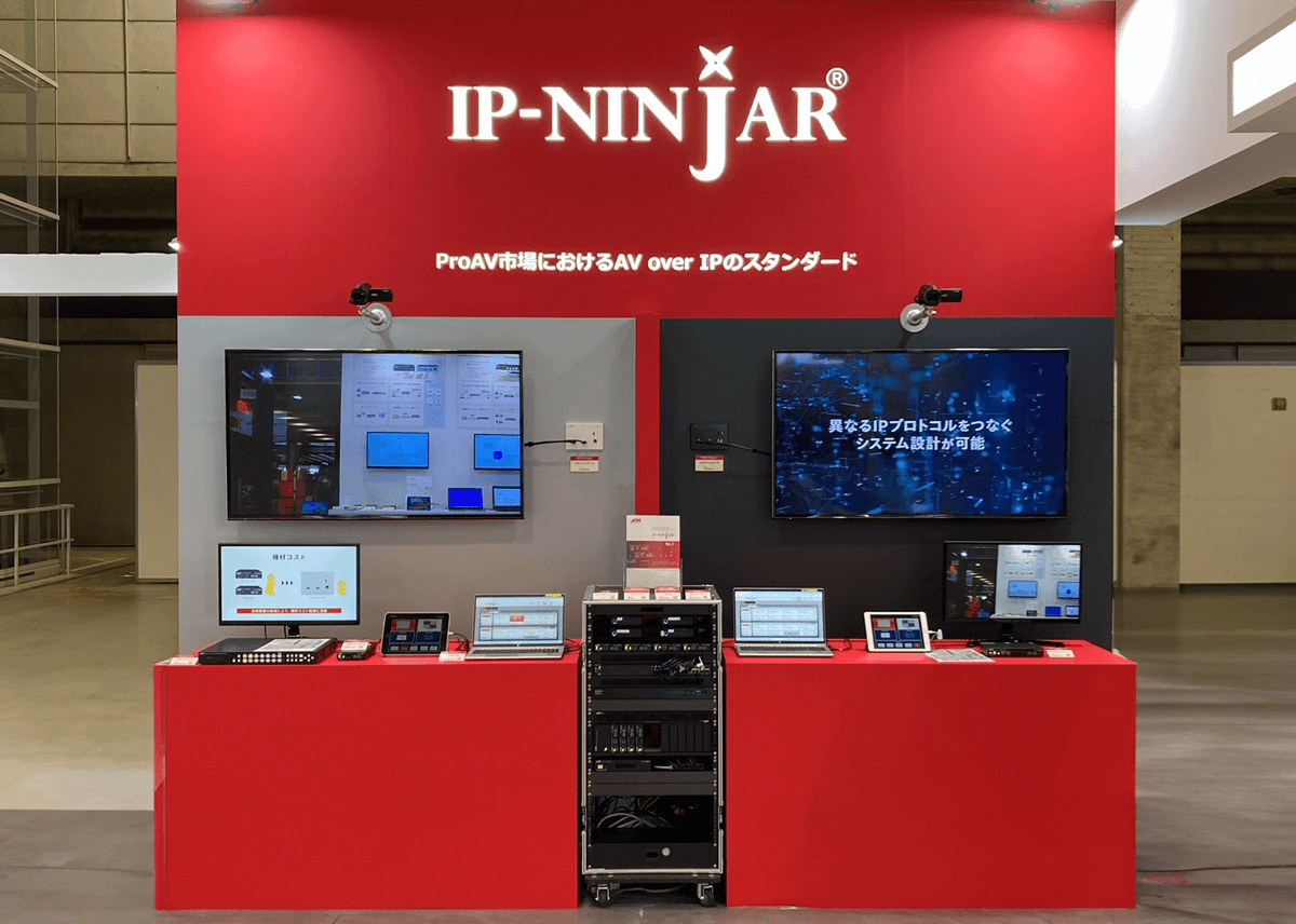 ネットワークスイッチを使用したAV over IPシステムだけでなく、1対1接続のビデオ延長による従来型AVシステムにも対応できるIP-NINJARシリーズ製品を多数展示。