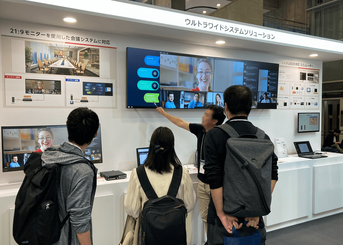 会場では、21:9の入出力機能を備えたプロトタイプモデルにより、Microsoft Teams Roomの新機能であるMTR Front Rowでの活用が想定される、ウルトラワイドディスプレイを使用したデモンストレーションを実施しました。