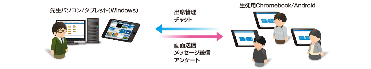 | 接続先の教室 | 先生からネットワーク上にいる生徒タブレットに接続、または生徒から教室を選択して先生と接続が可能です。 |