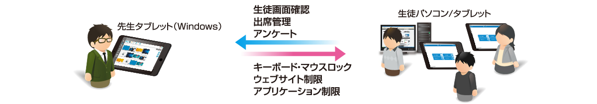 | 先生画面の表示 | 先生パソコンのデスクトップ画面を生徒タブレットに表示できます。 |