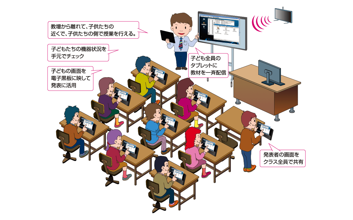 | 設定変更 | 生徒タブレットの接続設定を先生パソコンから一括して変更することが可能です。 |