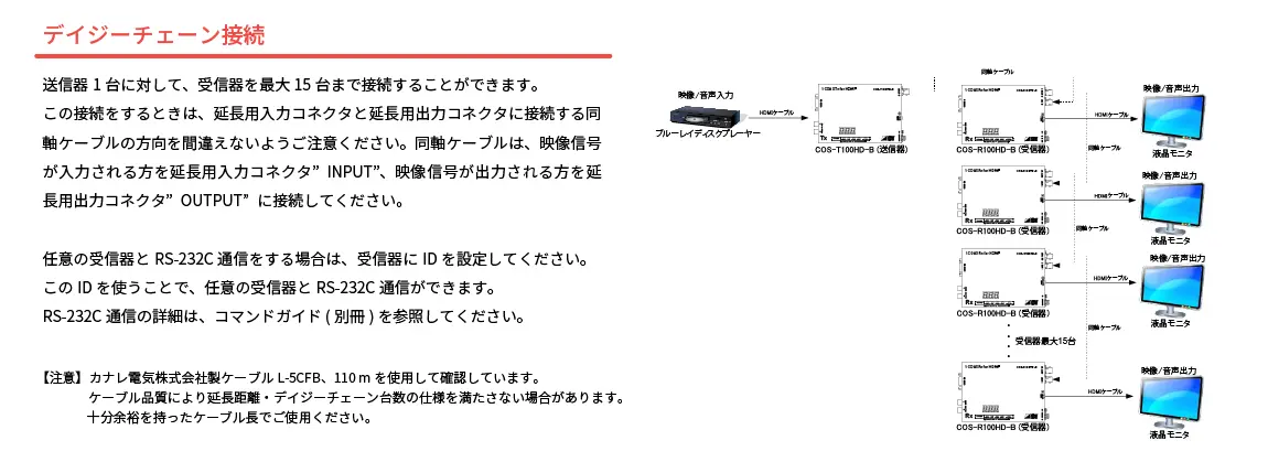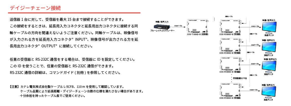 送信器(COS-T100HD-B)1台に対して、受信器(COS-R100HD-B)を最大15台まで接続することができます。