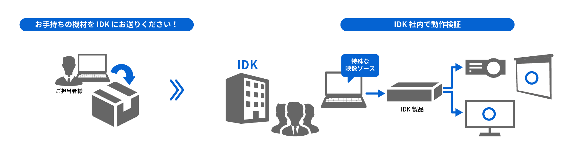 IDKにお⼿元の機材を送っていただければ、システム導⼊前に実機での動作検証を⾏うことができます。