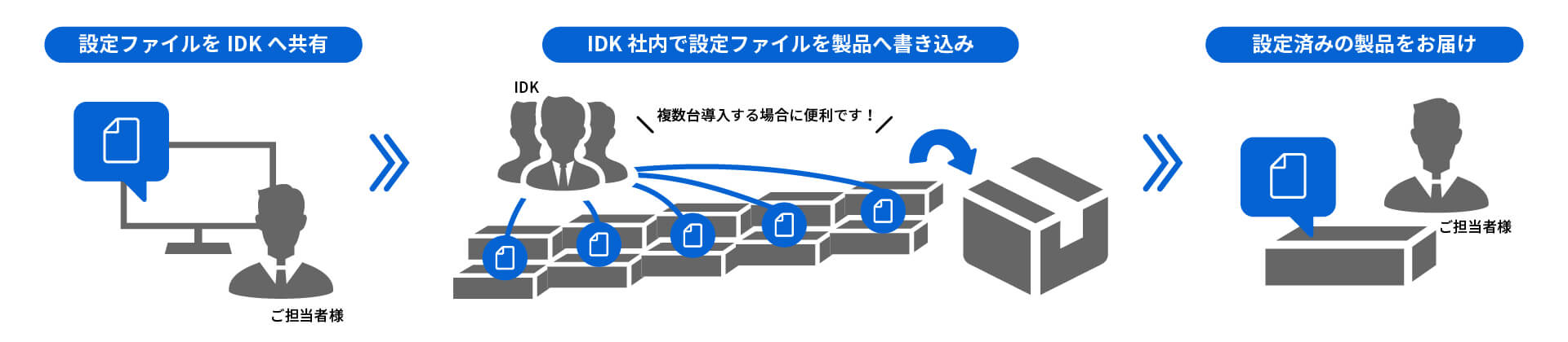 ご注文をいただいた機器に対して、お客様から事前に提供いただいた設定ファイルの書き込みをおこない納品いたします。