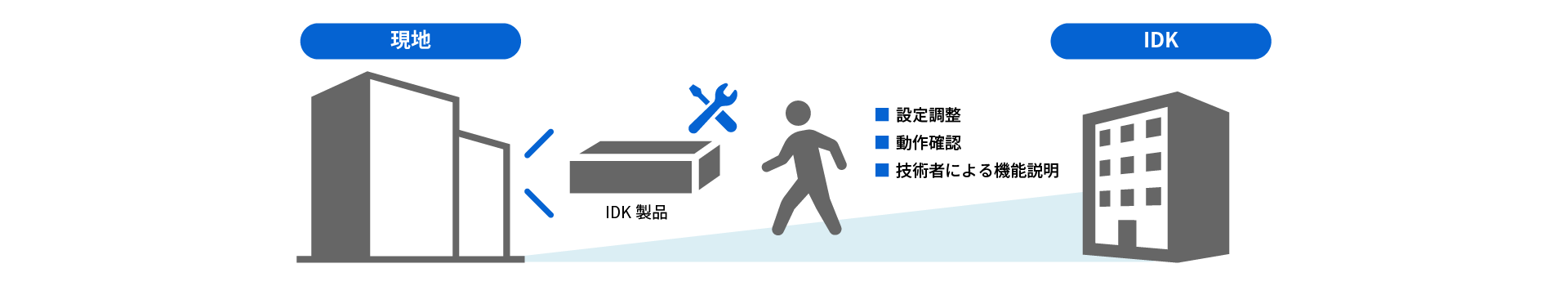 現地でのIDK製品の設定調整などの導⼊サポートも⾏っております。